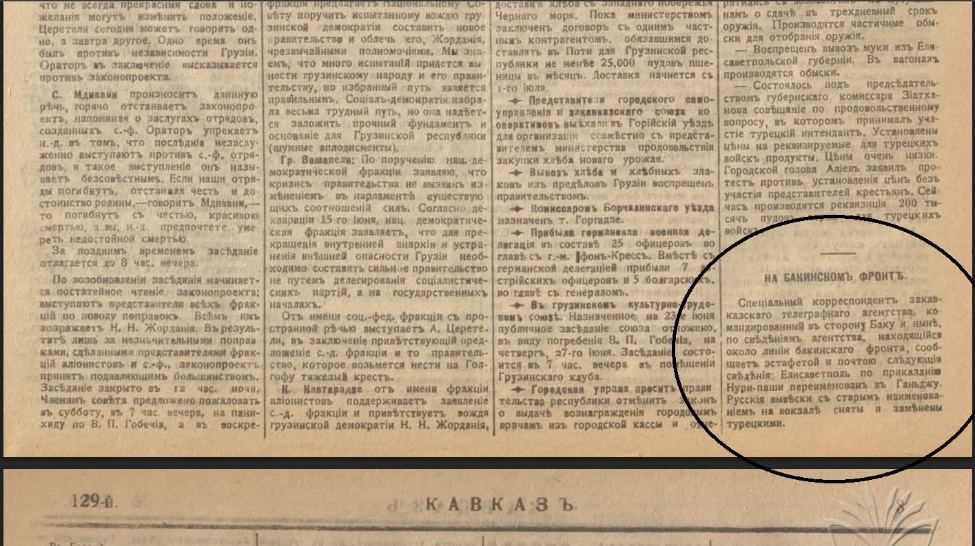 “Zaqafqaziya Teleqraf Agentliyinin Bakı istiqamətində ezam olunmuş xüsusi müxbirinin məlumata görə-Nuru Paşanın əmri ilə Yelizavetpolun adı dəyişdirilərək Gəncə adlandırılmışdır. Vağzalda köhnə adı olan rus lövhələri götürülərək türk lövhələri ilə əvəz edilib”