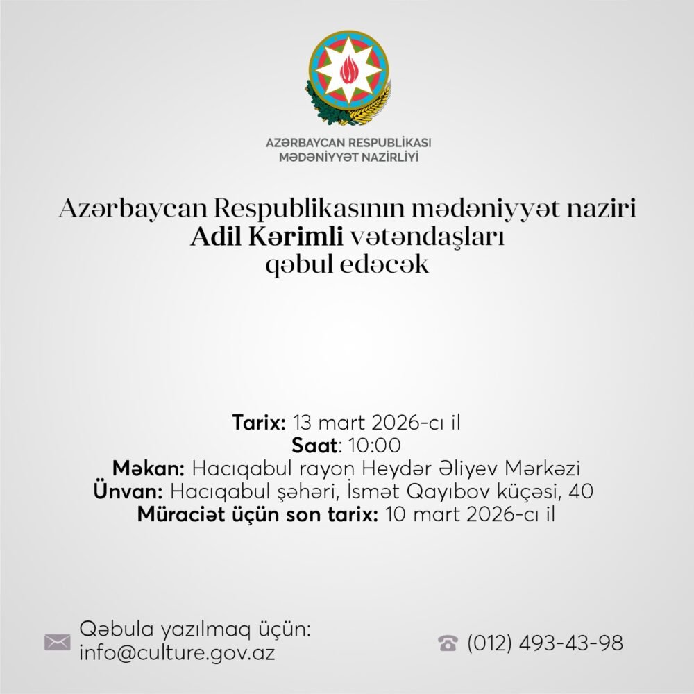 ELAZ.İNFO Mədəniyyət Nazirliyinə istinadən xəbər verir ki, mərkəzi icra hakimiyyəti orqanları rəhbərlərinin rayonlarda vətəndaş qəbulu cədvəlinə uyğun olaraq növbəti görüş keçiriləcək. Mədəniyyət naziri Adil Kərimli 2026-cı il martın 13-də, saat 10:00-da Hacıqabul rayonunda vətəndaşları qəbul edəcək.