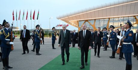 Füzuli Beynəlxalq Hava Limanında ali qonağın şərəfinə fəxri qarovul dəstəsi düzülmüşdü.